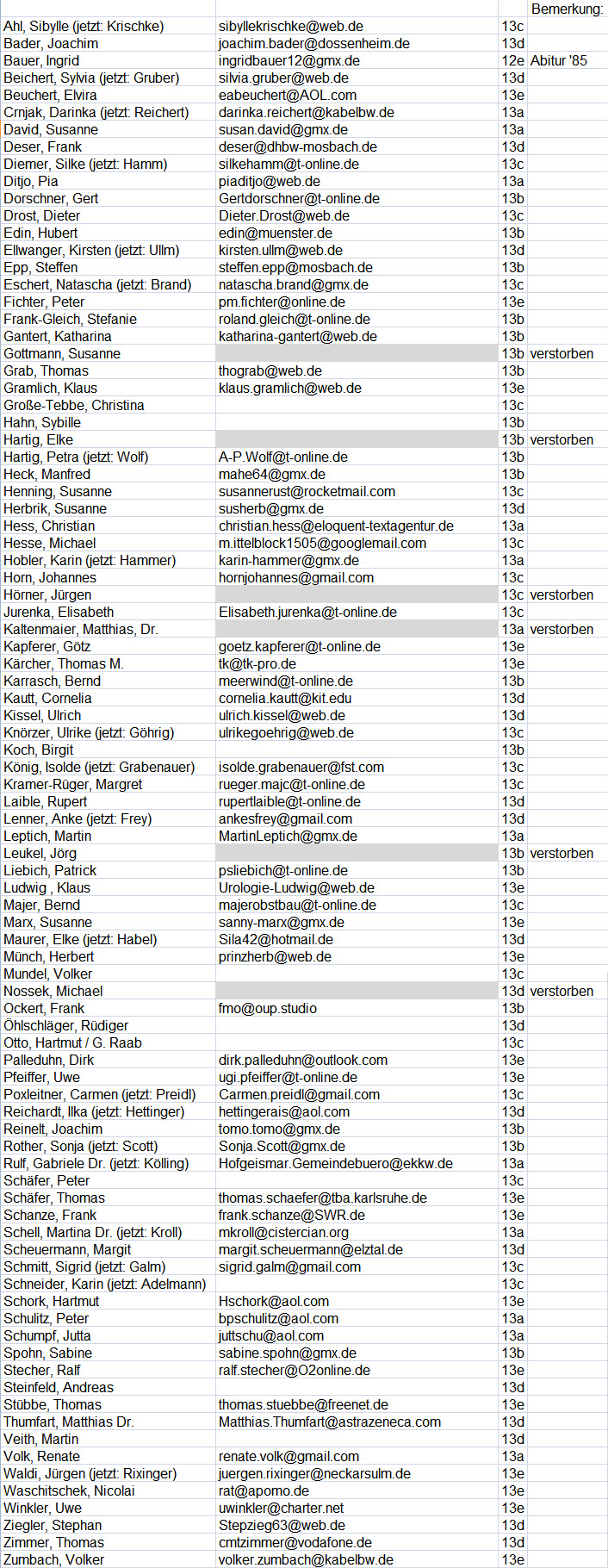 Ich habe hier versucht, die Namen aller Abiturienten (basierend auf der Liste von Margit Scheuermann) von 1984 zusammenzutragen. Sollte jemand wünschen, daß seine EMail-Adresse hier nicht erwähnt wird, dann bitte mich kontaktieren.