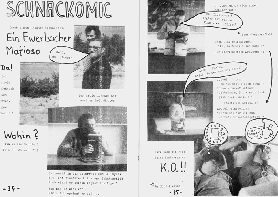 Eine Anekdote aus dem LK Physik mit Schnacko ist mir noch eingefallen: Ich war ja die letzten 3-4 Jahre meiner Schulzeit im Tintenklecks aktiv. Der wurde ja damals noch komplett in Eigenregie erstellt, d. h. Artikel erstellen, auf Druckfahnen abfotografieren, Etchen, mit einer Offset-Druckmaschine drucken und per Hand heften (1200 Stück!).