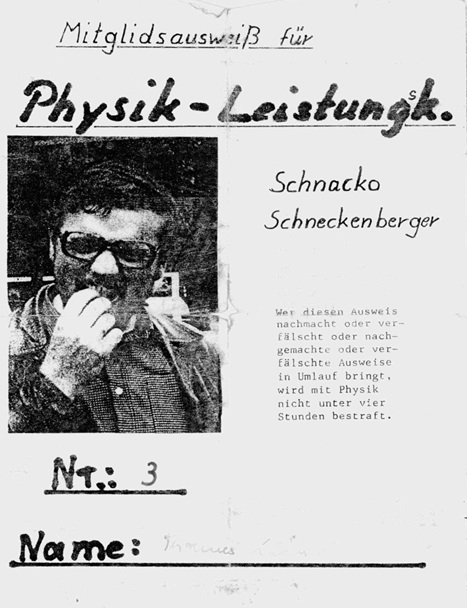 Stimmt, wir waren nur 9 Leute im Physik-LK, normalerweise hätte der gar nicht stattgefunden. War ja 1982 Null-Bock, vor allem auf Naturwissenschaften. Wurde dann aber durchgesetzt und irgendwann haben wir diesen "Mitglidsausweiß" ersonnen ... Schnacko beim Essen einer Bratwurst!